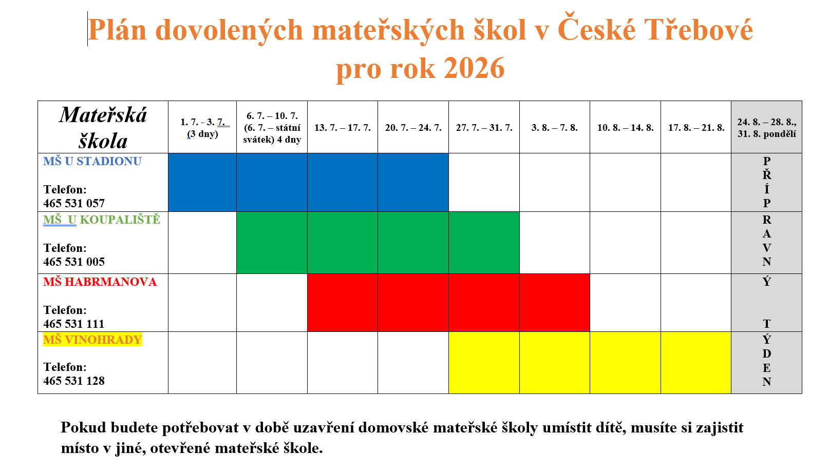 zápis dětí k předškolnímu vzdělávání pro školní rok 2026/2027 proběhne 8. dubna 2026 v době od 8:00 do 16:00 hodin v budově mateřské školy na adrese U Stadionu 602, Česká Třebová.